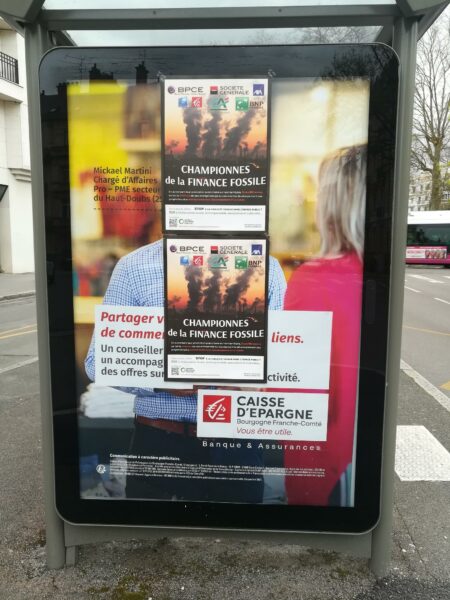 Depuis quelques jours, des membres des associations Les Amis de la Terre Côte-d'Or et ATTAC21, et des citoyens engagés pour le climat recouvrent les publicités des banques climaticides imposées à la vue de tous sur les panneaux publicitaires des abribus.