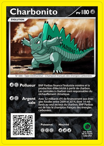 « Charbonito » est la toute première carte PokeTerre avec l’image de la BNP Paribas via un monstre fumant devant un paysage anéanti. Une métaphore pour illustrer la triste réalité: la banque BNP Paribas a financé l’industrie minière et la production d’électricité à partir de charbon.